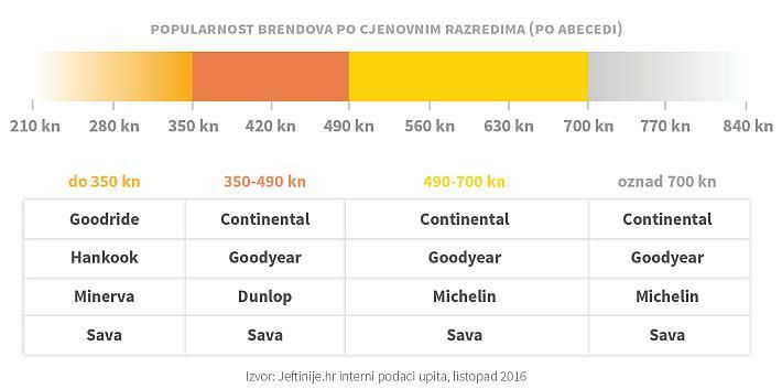 CJENOVNI RAZREDI: Otkrivamo top 5 marki u svakom razredu Analizom kupovnog ponašanja smo provjerili i koje marke su najpopularnije u pojedinim cjenovnim razredima. Među gumama iznad 700 kn najpopularnije su (po abecedi) Continental, Goodyear, Michelin i Sava, a među gumama ispod 350 kn Goodride, Hankook, Minerva i Sava.
