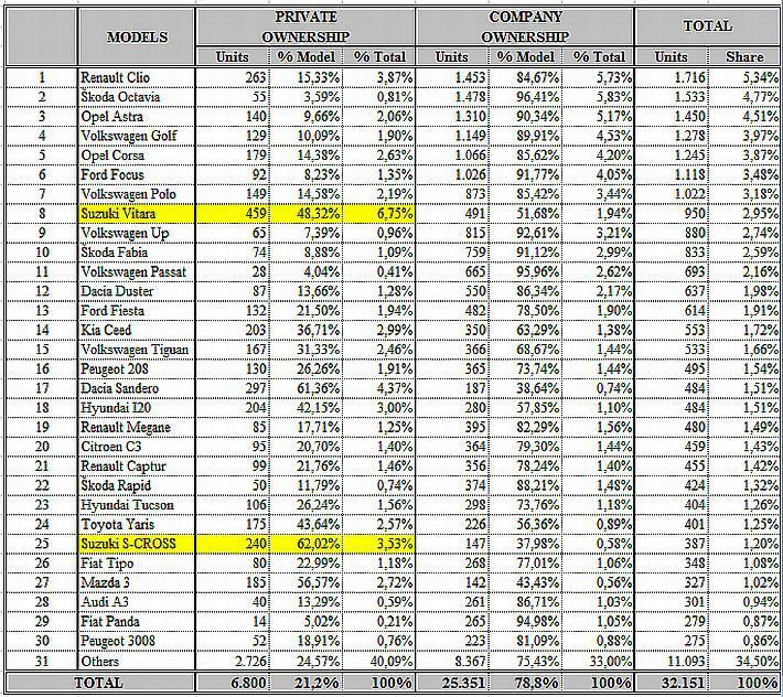 Suzuki je marka automobila koja je najprodavanija privatnim kupcima u Hrvatskoj u prvih šest mjeseci ove godine. Premda je globalno tržište poraslo, istovremeno se udio privatnih kupaca u odnosu na prošlu godinu smanjio, što bi značilo da je broj privatnih kupaca ostao na otprilike istoj razini (samo je tržište poraslo na osnovu flotnih prodaja i izvoza). Drugu godinu za redom Suzuki je na prvom mjestu po prodaji privatnim kupcima, Vitara je i dalje najprodavaniji model u Hrvatskoj, dok je S-Cross četvrti najprodavaniji model privatnim kupcima u Hrvatskoj.